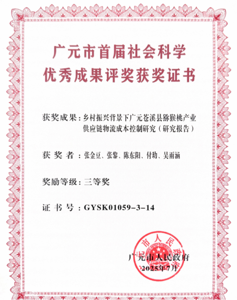 近日,数字经济学院张金豆老师团队(团队成员张黎、陈东阳、付玏、吴雨涵)完成的《乡村振兴背景下广元苍溪县猕猴桃产业供应链物流成本控制研究》(研究报告),在广元市首届社会科学优秀成果评奖中荣获三等奖。