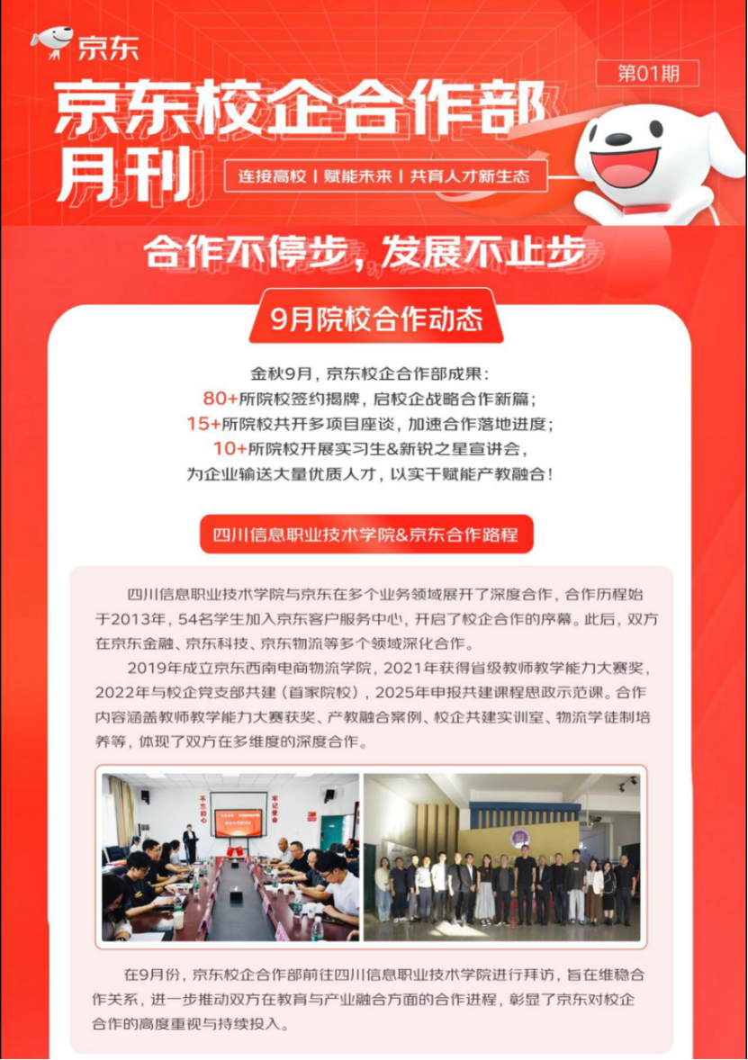 此次登上京东校企合作部月刊首刊,是对我院与京东多年合作成效的权威认可,也彰显了企业对我院人才培养质量的高度信赖。在近期双方的走访交流中,校企进一步达成共识,未来将持续深化教育与产业的融合联动,积极跟进课程建设,深化企业真实项目融入课堂教学,以更精准的合作模式赋能人才成长,为数字经济产业发展输送更多实用型、技能型优质人才。