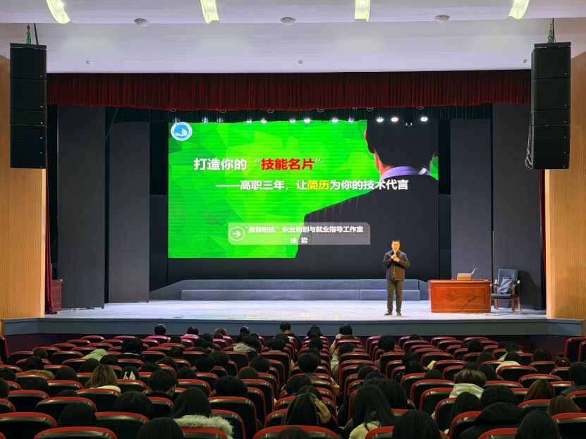 2025年11月27日下午,数字经济学院“数智职航”职业规划与就业指导工作室为全体大一新生举办入学教育讲座。工作室徐岩老师以“打造你的‘技能名片’——高职三年,让简历为你的技术代言”为题进行了分享。