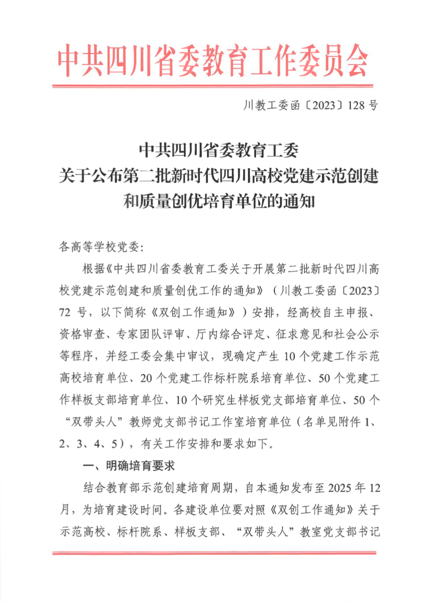 近日,省委教育工委公布了第二批新时代四川省高校党建示范创建和质量创优培育单位名单,学院营销电商联合党支部成功入选“四川高校党建工作样板党支部”培育单位。