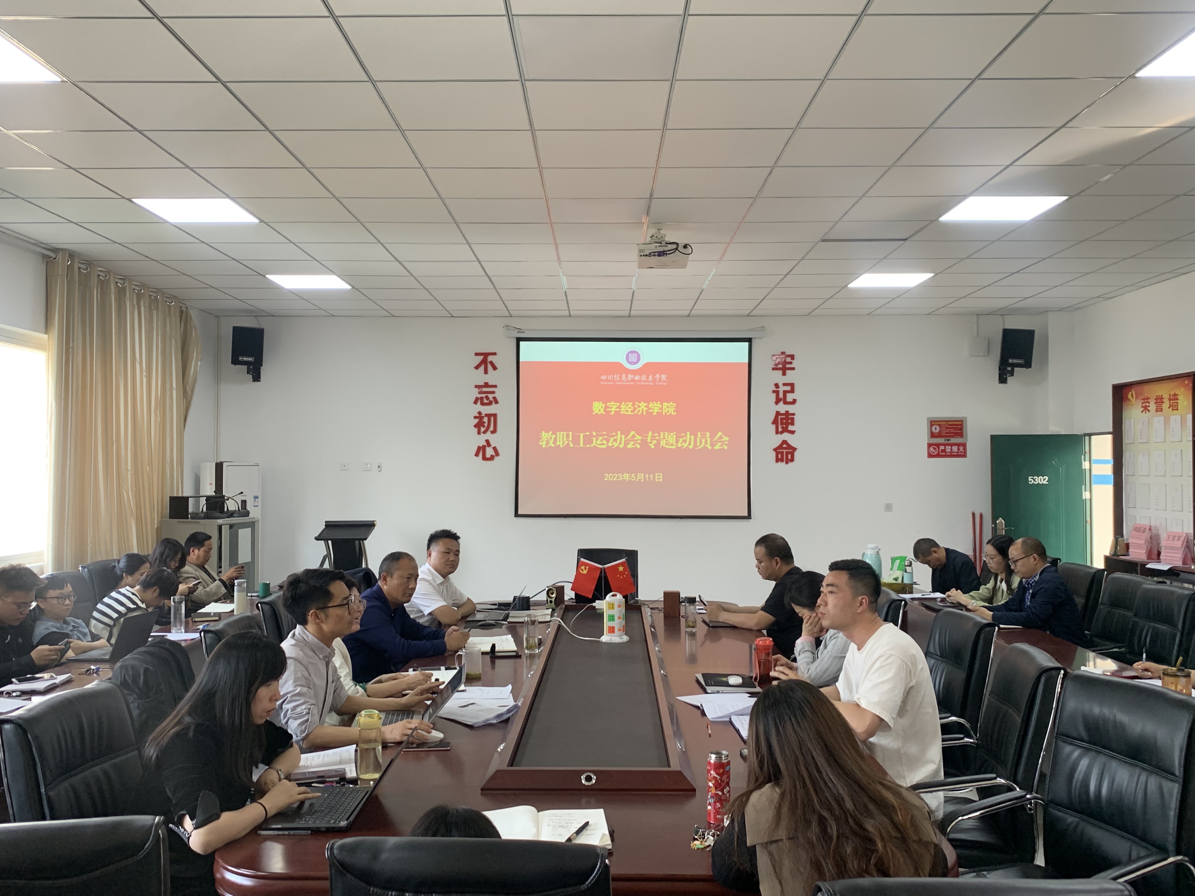 5月11日下午,数字经济学院在5302会议室召开教职工运动会动员会。党总支书记张健华、院长王晓康、副院长杜君及全体教职工参加,会议由任宇鹏主持。